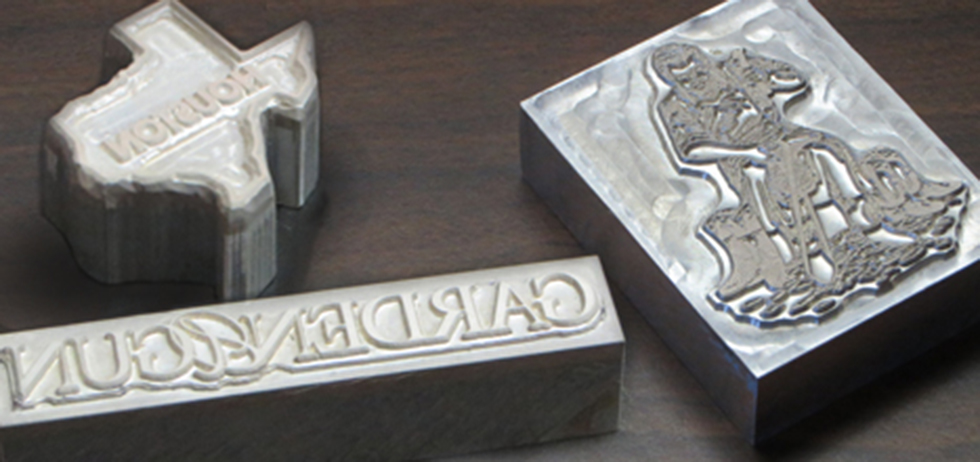 Brass is suitable for embossing, debossing and stamping. These type of dies are cut on a CNC machine. They are more versatile than the magnesium and copper plates. Because they are cut on the machine it gives us the ability to use a specific angles on the dies and a specific depths. This material also lends itself to be used for longer runs on the printing presses and leather machines.